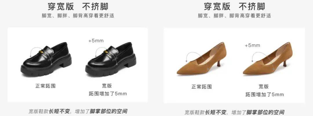 这种宽度细分趋势已从运动鞋蔓延至正装鞋领域。思加图推出的秋叶伯爵乐福鞋与 Melody 高跟鞋,均采用 “一鞋两版” 设计,宽版仅在脚掌部位增加 5mm 跖围空间,保持鞋长与售价不变。其乐的商务皮鞋则通过标准楦与加宽楦的分类,满足不同脚型需求。